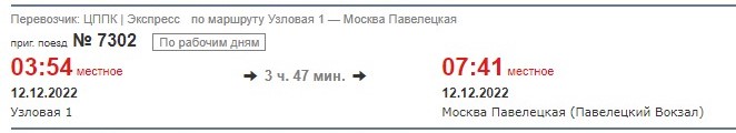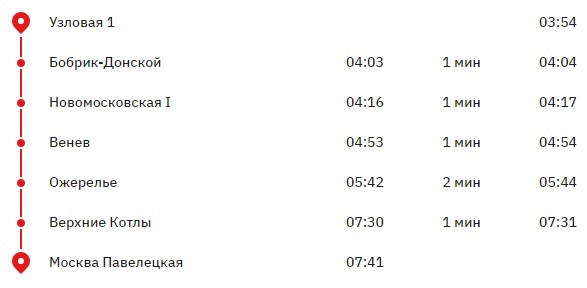 Время в пути, по данным портала РЖД, займет 3 часа 47 минут: из Узловой поезд отправится в 3:54, а на Павелецкий вокзал в Москве прибудет в 7:41. Ходить экспресс будет по рабочим дням. Отправление из Москвы — в 19:14, прибытие в Узловую — в 23:10.