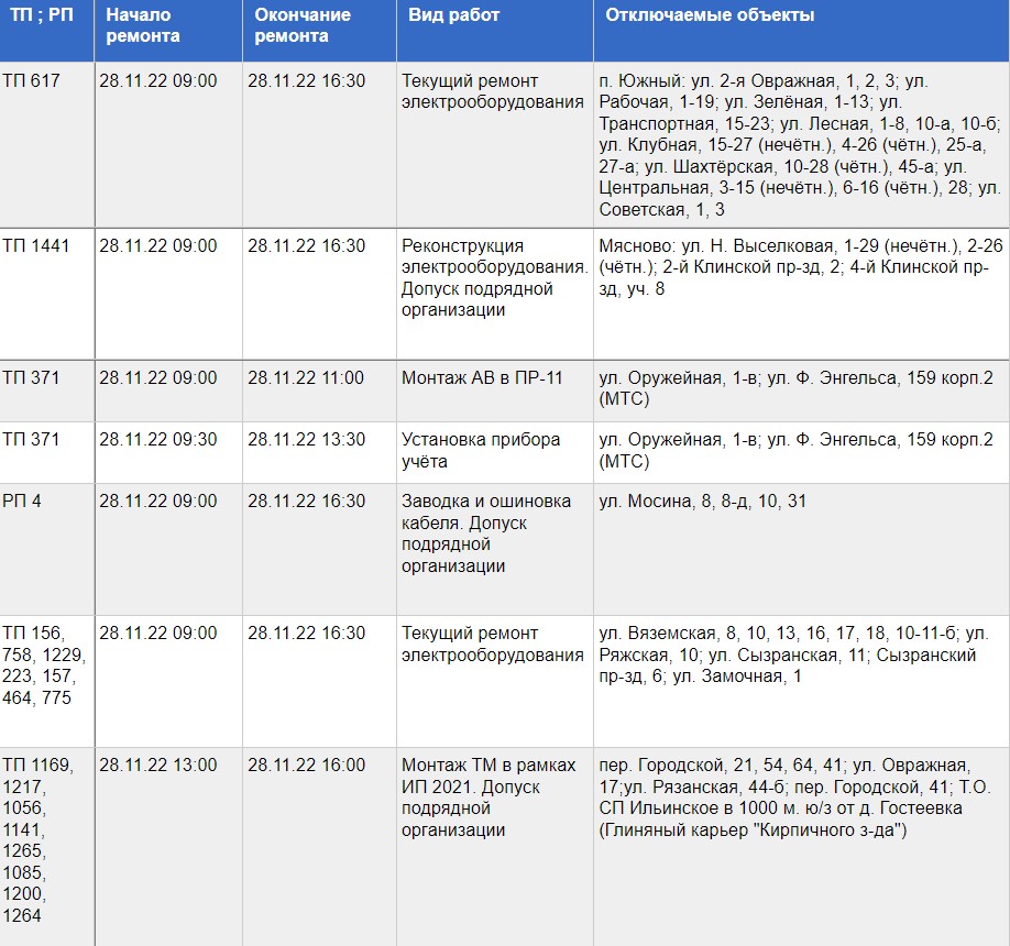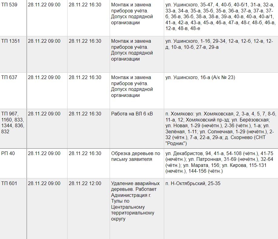 28 ноября «Тульские городские электрические сети» обесточат часть областного центра. Это связано с плановыми работами организации — текущим ремонтом и реконструкцией электрооборудования, монтажом и установкой приборов учета, обрезкой и удалением аварийных деревьев.