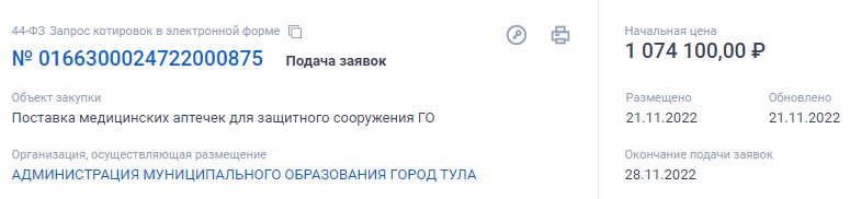 Администрация Тулы приобретет 23 набора первой медицинской помощи для защитного сооружения гражданской обороны. За одноразовые аптечки, не содержащие лекарственные средства, для бомбоубежища заплатят чуть больше 1 млн 74 тыс. рублей.