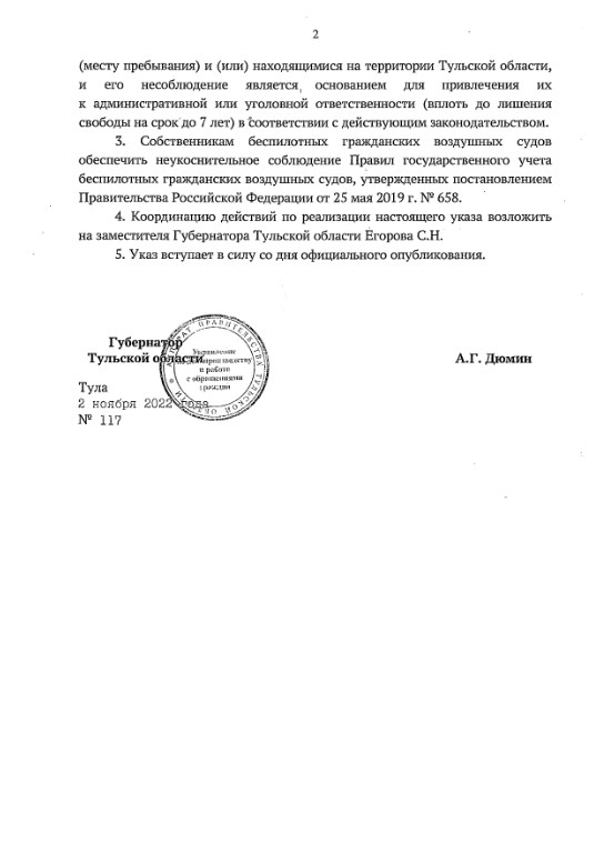 Владельцам беспилотников нужно неукоснительно соблюсти действующие Правила учета. Запрет является обязательным для всех лиц на территории Тульской области. За его нарушение может грозить административная и уголовная ответственность — вплоть до лишения свободы на 7 лет.