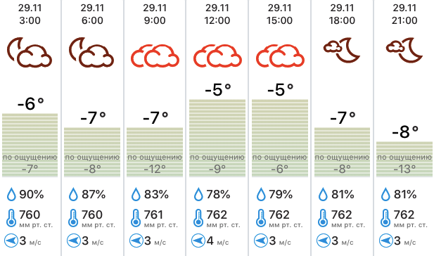 29 ноября в Туле обещают облачную погоду без осадков. По прогнозу синоптиков, юго-восточный ветер поднимется до 3-8 м/с, а столбик термометра покажет -7…-2 градуса.