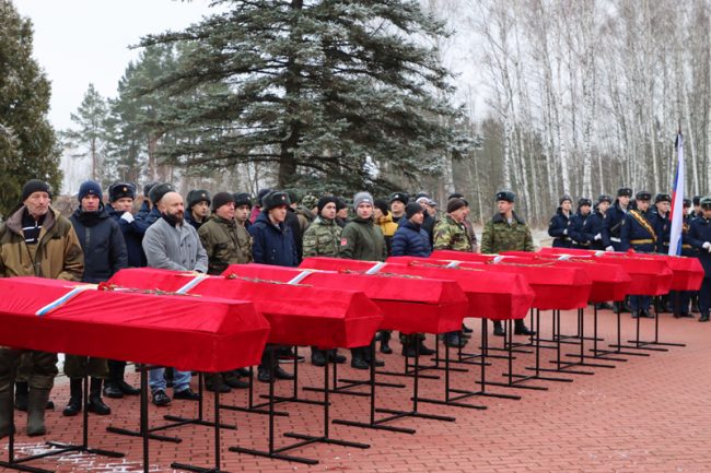 – Раскопки проводили в течение полугода. За этот срок было поднято 69 красноармейцев. Общий список захороненных – 77 человек. К сожалению, пока восемь человек не найдены. В 2023 году мы продолжим поиски. Сегодня на захоронении присутствуют родственники бойцов из Ивановской области и Санкт-Петербурга, – отметил председатель совета Тульской региональной общественной организации поискового объединения «Высота» Игорь Дудин.