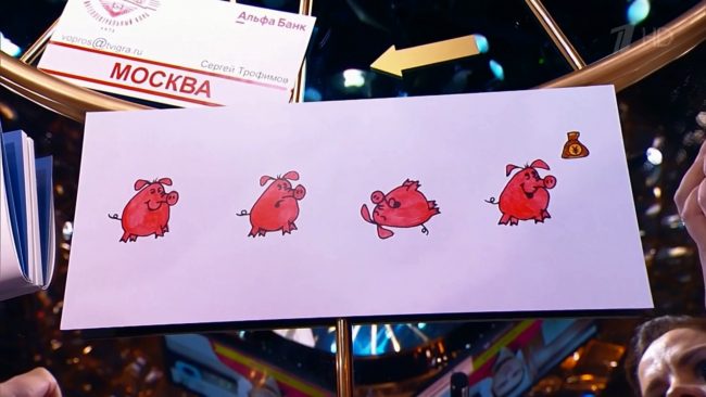 Подсказки зала не повлияли на исход дела – команде пришлось брать дополнительную минуту в кредит. Очередной мозговой штурм не принес результата – правильного ответа за столом не оказалось. Ведущий заметил, что знатоки за две с лишним минуты обсуждения так и не коснулись темы, почему на картинках изображена именно свинья, а не другое животное.