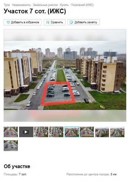 В Туле на территории жилого комплекса «Времена года» продают земельный участок под индивидуальное жилищное строительство. Некое частное лицо на сайте бесплатных объявлений выставило на продажу участок площадью семь соток. Стоимость — немного больше трех миллионов рублей.