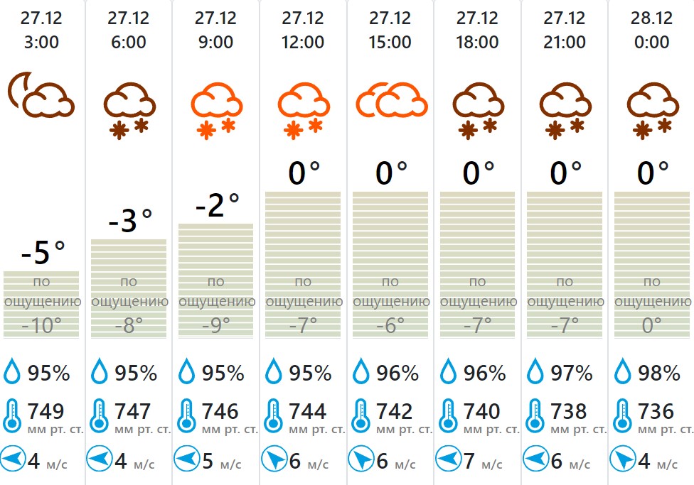 Ночью температура останется на прежнем уровне, осадки продолжатся. Ветер — 4 м/с. Влажность воздуха — более 90%. Атмосферное давление упадет еще до 736 мм рт. ст.