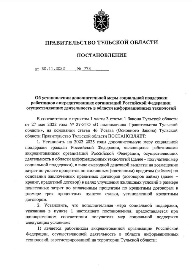 В Тульской области сотрудникам IT-компаний возместят затраты по уплате процентов по ипотеке. Соответствующее постановление за подписью первого заместителя губернатора Дмитрия Миляева опубликовано на портале правовых актов.