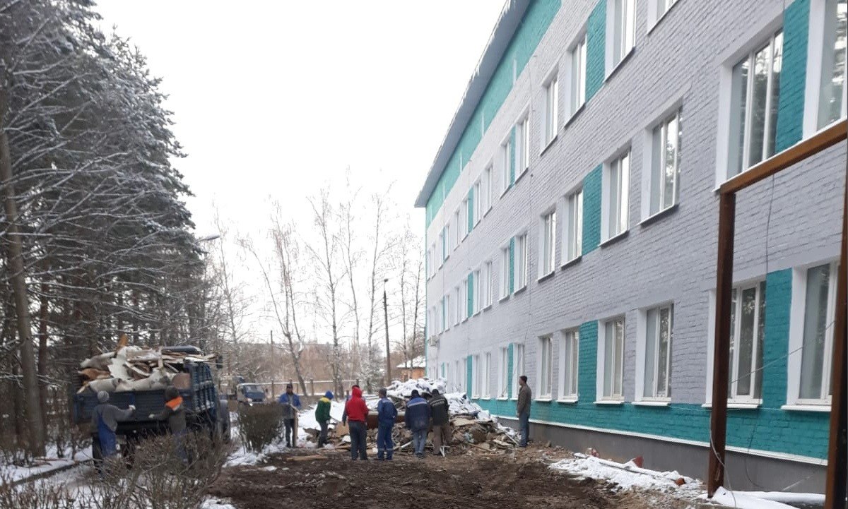 В трехэтажном здании на двух этажах ведется отделка фасада, укладка напольных покрытий и подготовка стен к покраске, отделка стен плиткой. На третьем все внутренние работы закончены.