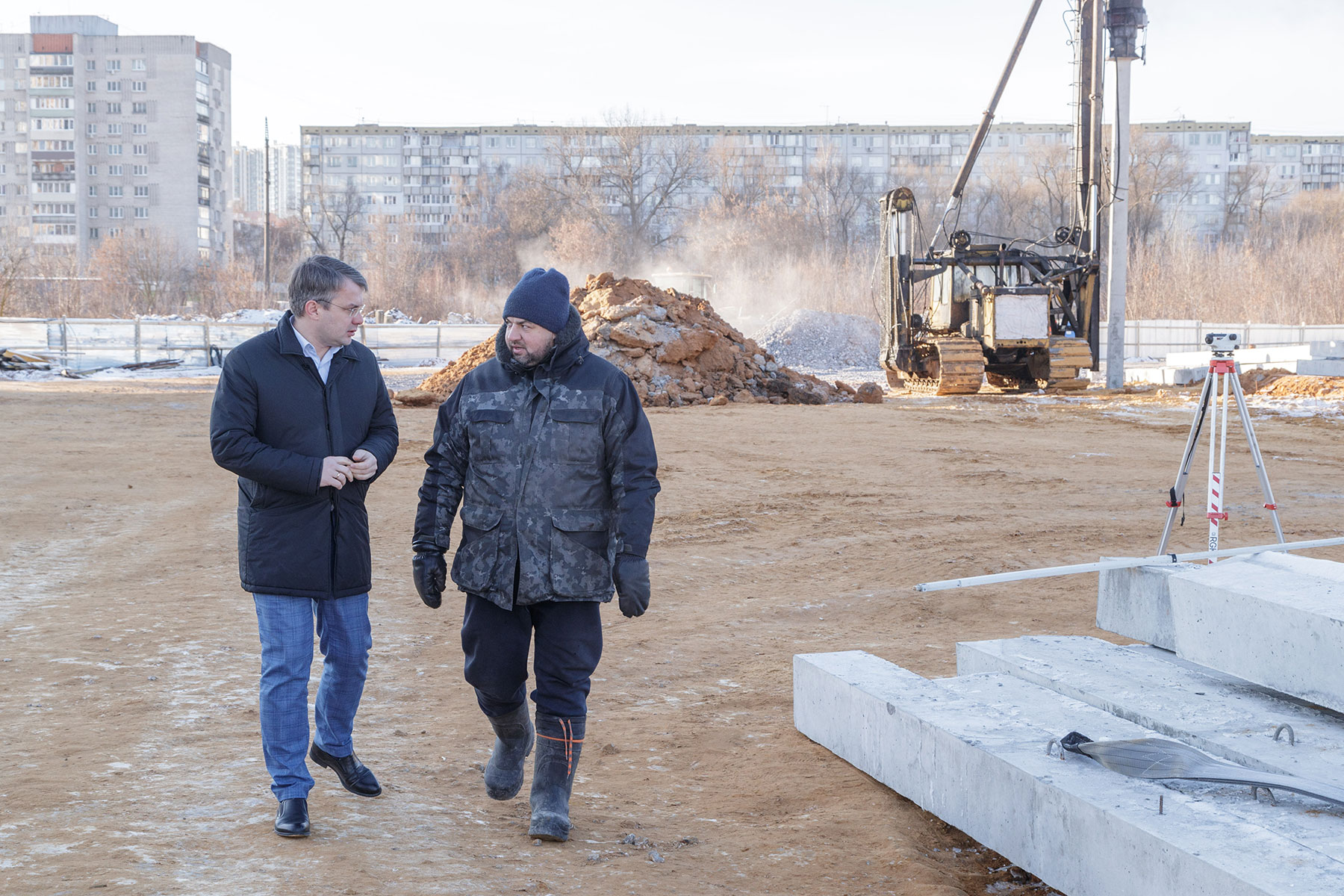 Предыдущий подрядчик не справился с выполнением работ. Был заключен контракт с новой организацией. Она уже приступила к строительству. На данный момент проводится устройство фундамента строящегося здания в виде свайного поля и отсыпка участка щебнем и песком с послойным уплотнением.