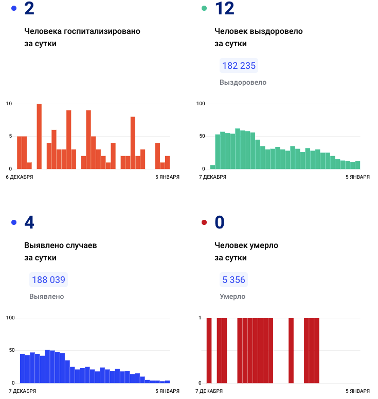 За последние сутки в Тульской области зарегистрировали четыре новых случая коронавируса. Об этом 5 января сообщили в федеральном оперативном штабе. Двое заболевших были направлены на лечение в инфекционный госпиталь. Летальных случаев среди ранее инфицированных жителей региона не выявлено, 12 пациентов выздоровели.