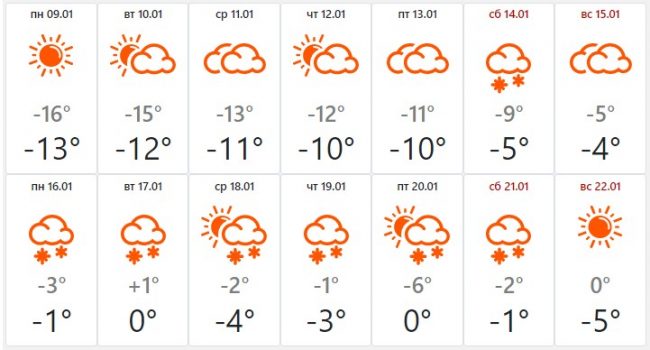 В понедельник, 16 января, ожидается -3…-1 градус, на следующий день потеплеет до 0 градусов. Ждать сильных морозов на Крещение не стоит — 19 января в среднем ожидается до -3 градусов, а к выходным похолодает до -5.
