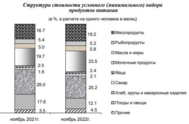 Стоимость минимального набора продуктов в конце ноября составила 5 379,05 рублей и по сравнению с предыдущим месяцем выросла на 0,4%. В структуре стоимости (в расчете на одного человека) 25,2% составляют хлеб, крупы и макаронные изделия, 23,5% — молочные продукты, 19,2% — мясо. 2,1% и 2,4% — у сахара и яиц.
