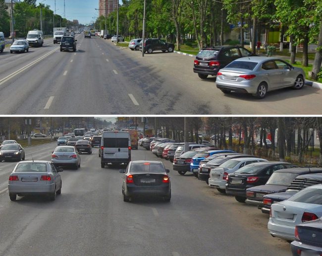 «Там, где карманы имеют глубину 5 метров (например, на четной стороне проспекта Ленина от ул. Первомайской до ул. Болдина), проблем нет: машины спокойно умещаются в карманы и задняя часть на дорогу не выступает, благодаря чему крайняя полоса свободна и движение осуществляется полноценно по всем 3 полосам!» — добавил Александр.