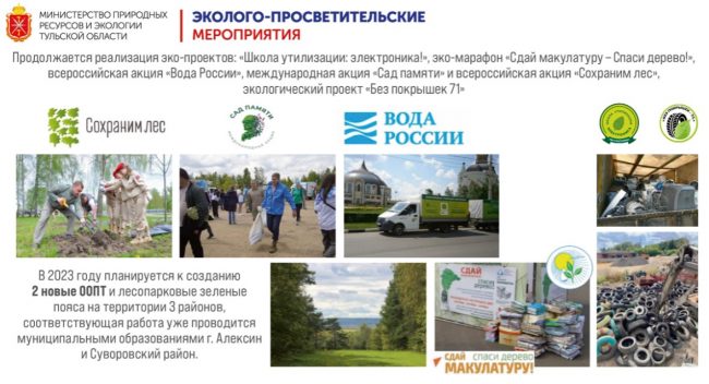 В Тульской области проводятся всероссийские акции «Вода России», «Сад памяти» и «Сохраним лес». В прошлом году в них приняли участие больше 8 000 человек. В результате было очищено более 350 км берегов рек и прудов и высажено больше 190 000 деревьев и кустарников.
