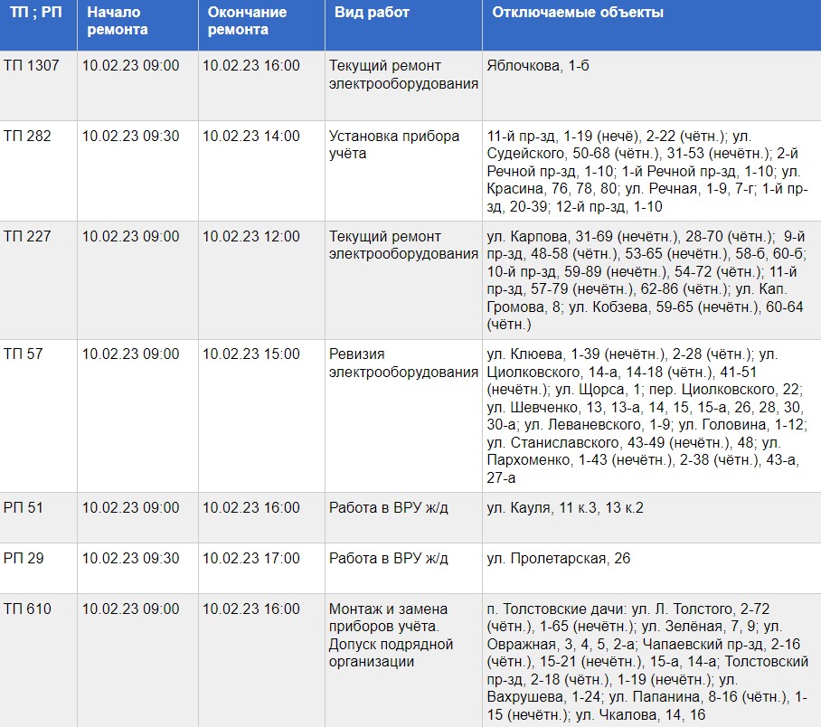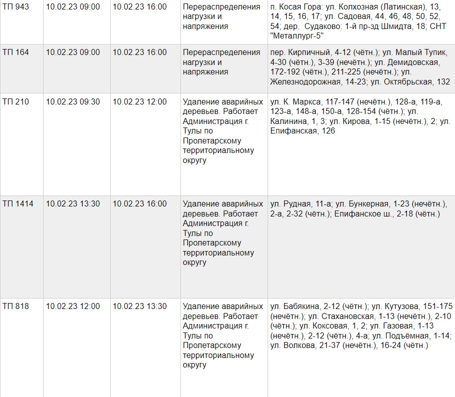 10 февраля «Тульские городские электрические сети» обесточат часть областного центра из-за плановых работ по текущему ремонту электрооборудования в Заречье, обрезке деревьев в Пролетарском районе, перераспределению нагрузки и напряжения на Косой Горе.