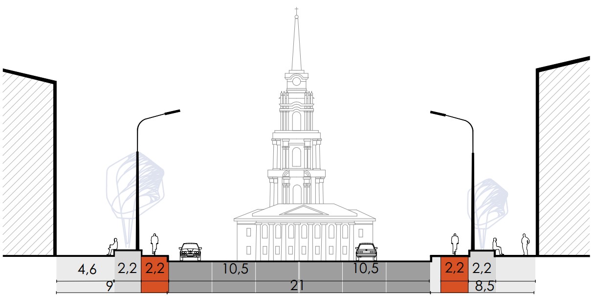 Согласно проекту, велодорожка располагается на краю тротуара и занимает ровно 2,2 метра, еще столько же — лавочки и объекты озеленения. Оставшееся пространство (порядка 4,6 метров) — отвели для пешеходов.