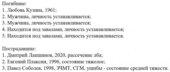 Из-под завалов были спасены семь человек. Как сообщили нашему изданию в министерстве здравоохранения Тульской области, трое из числа пострадавших были госпитализированы в Ефремовскую районную клиническую больницу им. А.И. Козлова. Это двое взрослых — мужчины 34 и 26 лет, а также 2-летний мальчик. В свою очередь канал 112 опубликовал примерный список жертв трагедии. Приводим его: