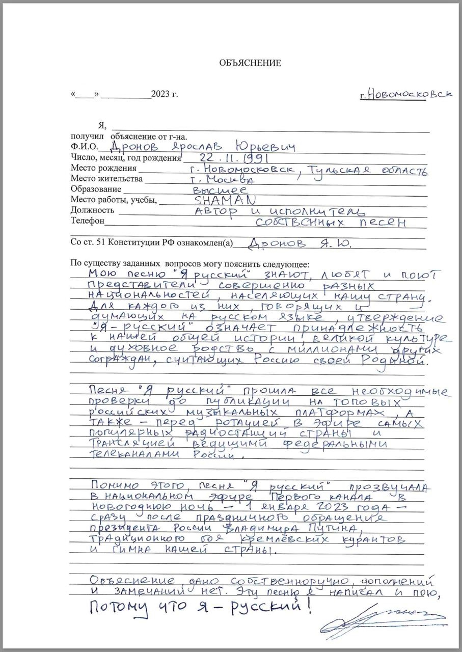 Песню «Я русский» исполнителя из Новомосковска SHAMAN (настоящее имя — Ярослав Дронов, прим. редакции) проверяют на экстремизм. В своем Telegram-канале артист рассказал, что на днях к нему обратились сотрудники уголовного розыска УМВД России по Тульской области: к ним поступило сообщение от некоего гражданина, считающего песню «Я русский» экстремистской и разжигающей в межнациональную рознь.