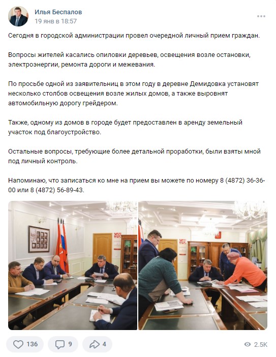 В январе самой популярной публикацией на странице Ильи Беспалова стал рассказ о личном приеме граждан, который провел врио главы администрации. Туляки увидели пост 2,5 тысячи раз, оставили 139 лайков, 9 комментариев и сделали 4 репоста.