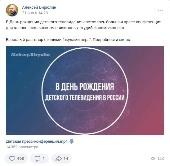 Так, например, рассказ о пресс-конференции, которую глава районной администрации устроил для юных журналистов-школьников, набрал 14 тысяч просмотров. Видео «пролайкали» более 400 раз, сделали 14 репостов и оставили один комментарий.