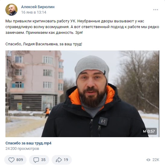 В другой видеозаписи Алексей Бирюлин рассказывает о позитивном примере работы управляющей компании. Этот пост стал самым просматриваемым за всю неделю – его увидели 22 тысячи раз. 809 человек оставили под постом свои лайки, 19 – сделали репосты, а также подписчики обсудили видео в комментариях – их оставили 35.