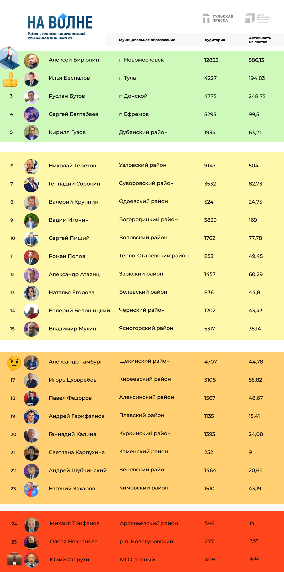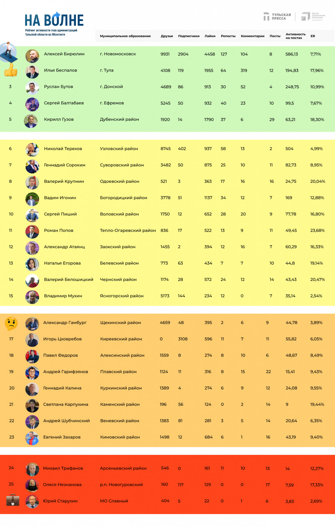 Сильное падение количественных показателей заметно на личных страницах глав администраций Узловского и Суворовского районов — Николая Терехова и Геннадия Сорокина. Узловский чиновник долго удерживал позицию в первой пятерке, однако на этот раз это не удалось. При этом активность на странице Геннадия Сорокина в конце 2022 года резко выросла и дала ему занять лидирующие позиции, но в этот раз количественные и качественные показатели уже не соответствуют пятерке лучших.