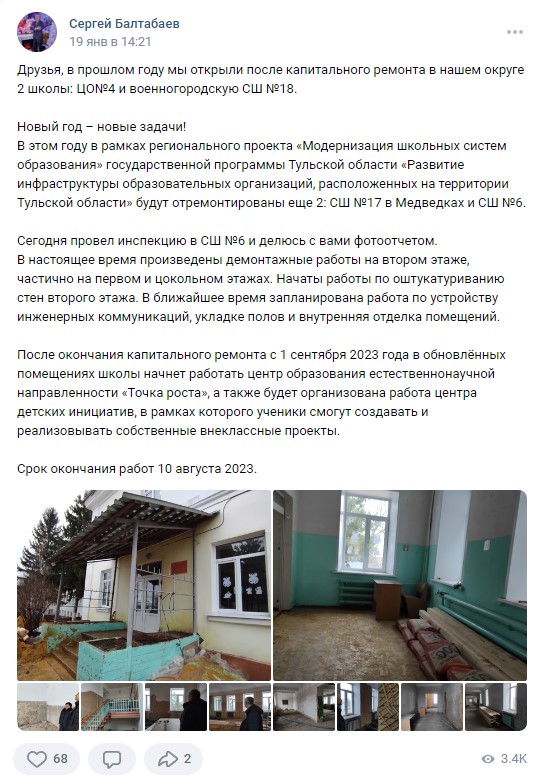Также Сергей Балтабаев не забывает рассказывать подписчикам и о благоустройстве города и важных социальных объектов. Например, 19 января чиновник сообщил о проведенной инспекции в одной из местных школ. К посту были также приложены фотографии здания, которое сейчас готовится к ремонту.