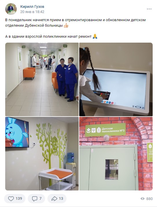 Также в январе Кирилл Гузов рассказал подписчикам об открытии после ремонта детского отделения районной больницы. Публикация стала не такой популярной как предыдущая и набрала тысячу просмотров, 139 лайков. Однако под ней подписчики оставили семь комментариев.