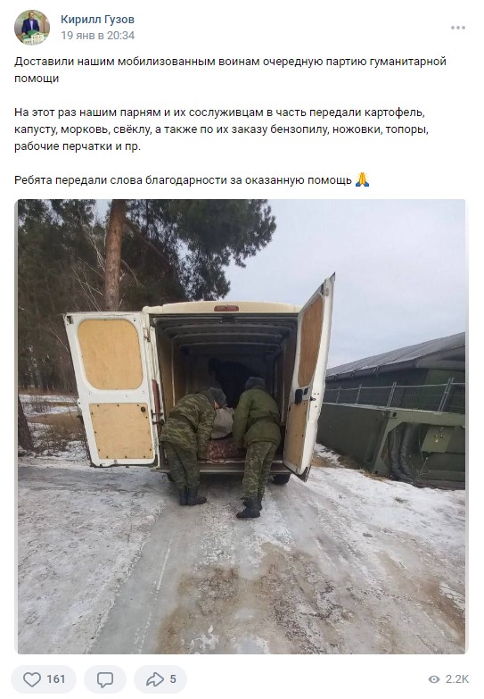За рассматриваемую нами неделю самым популярным постом на странице Кирилла Гузова оказалась публикация о доставке гуманитарного груза для мобилизованных. Она набрала 2,2 тысячи просмотров, а также 160 лайков. Комментарии под ней подписчики не оставляли.