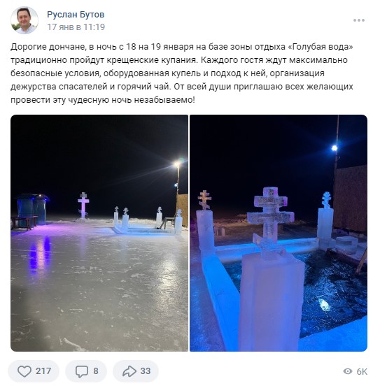 Другим популярным постом на странице Руслана Бутова стали фотографии купели, которую подготовили в Донском в преддверии Крещенских купаний. Подписчики оценили простую манеру изложения новостей от главы администрации. Публикация набрала 6 тысяч просмотров, более 200 лайков, 8 комментариев и 22 репоста.