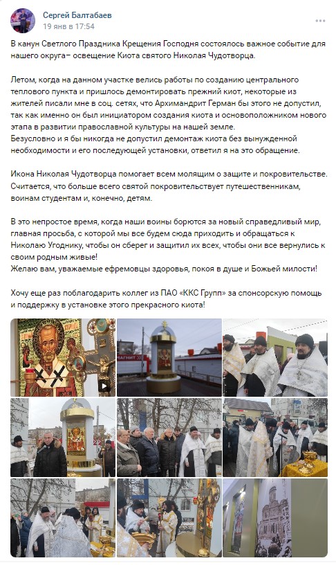 Другой пост на странице главы администрации Ефремова, набравший пять тысяч просмотров, рассказывает об освящении киота Николая Чудотворца в канун Крещения. Публикация набрала более 250 лайков, 3 комментария и 12 репостов.