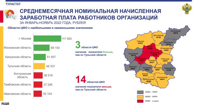 В Тульской области средняя зарплата за 11 месяцев 2022 года составила 48 336,6 рубля. Такие данные приводит Туластат. Это в 2,4 раза меньше, чем в Москве. В столице в 2022 году средняя зарплата составила 117 082,8 рубля.