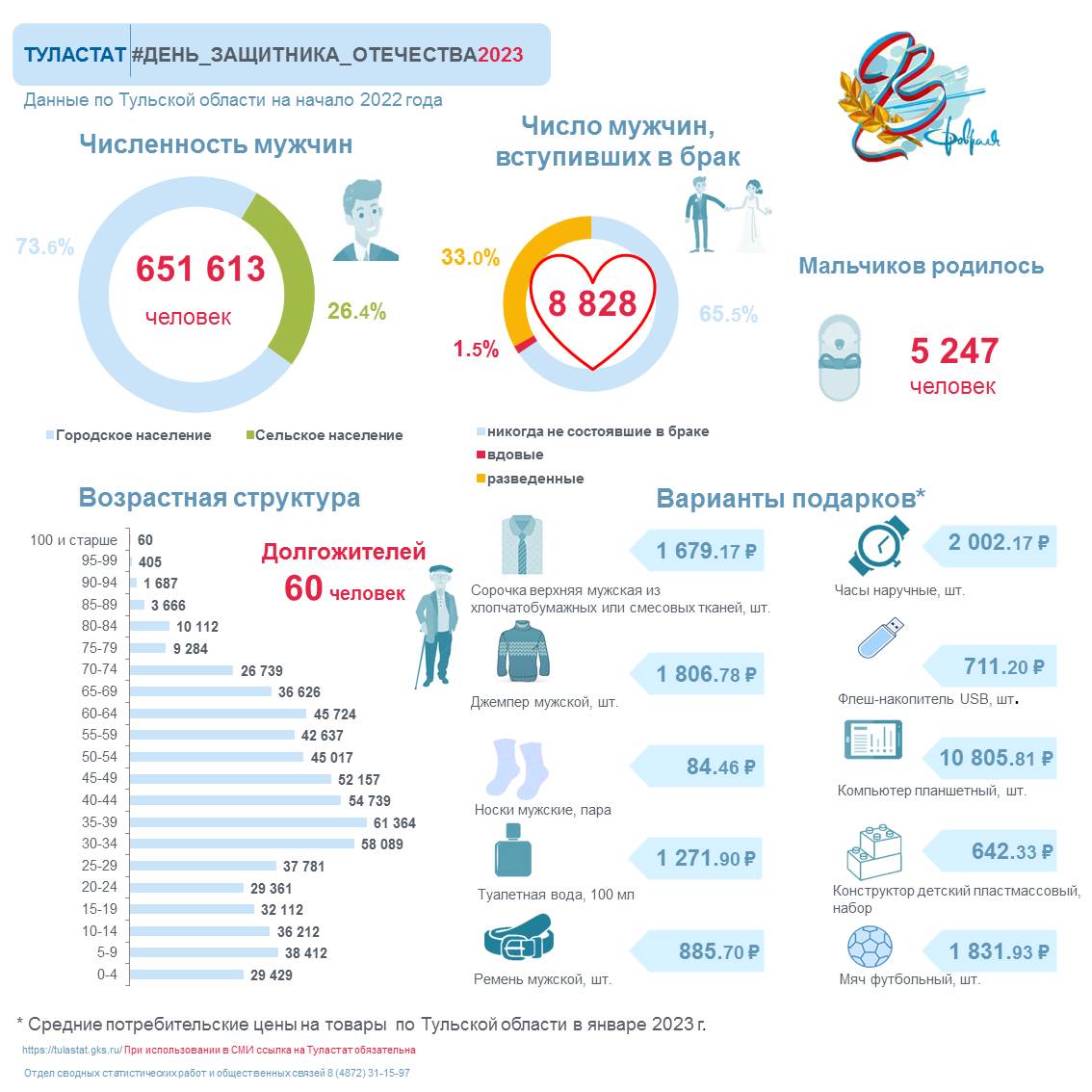 В Тульской области насчитывается более 651 тыс. мужчин. За год в регионе в брак вступили 8 828 представителей сильного пола. При этом из них 33% были в разводе, 65,5% никогда не состояли в браке, 1,5% — вдовцы. Об этом накануне Дня защитника Отечества сообщили в Туластате. В разрезе возрастных групп лидируют мужчины от 35 до 36 лет (61,3 тыс. человек), также в Тульской области живут 60 мужчин старше 100 лет.