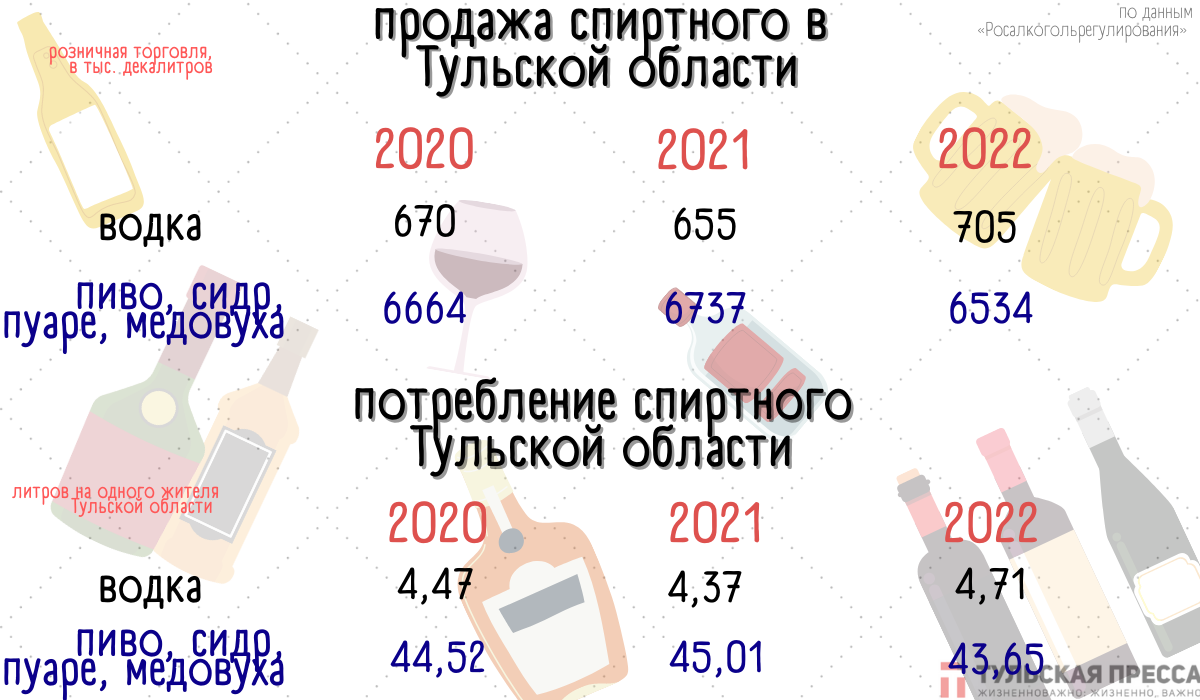 В Тульской области в 2020 году розничная продажа составила 6 664 тыс. декалитров (1 декалитр = 10 литрам), в 2021 году — 6 737 тыс. декалитров, в 2022 году — 6 534 тыс. декалитров. Продажа водки: 670 тыс. декалитров в 2020 году, 655 тыс. декалитров — в 2021 году, 705 тыс. декалитров в 2022 году.