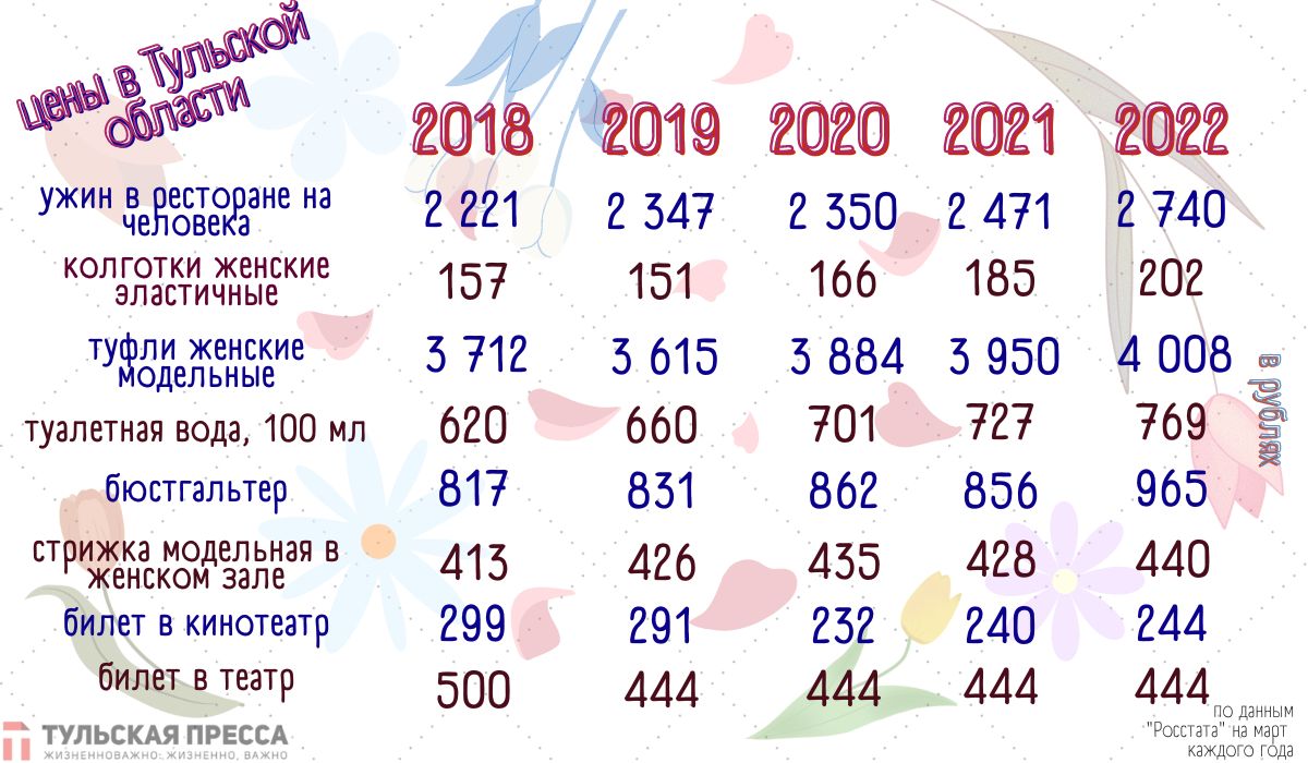 Например, если в марте 2018 года в Тульской области женские колготки стоили в среднем 157 рублей, то в 2022 году — уже 202 рубля.