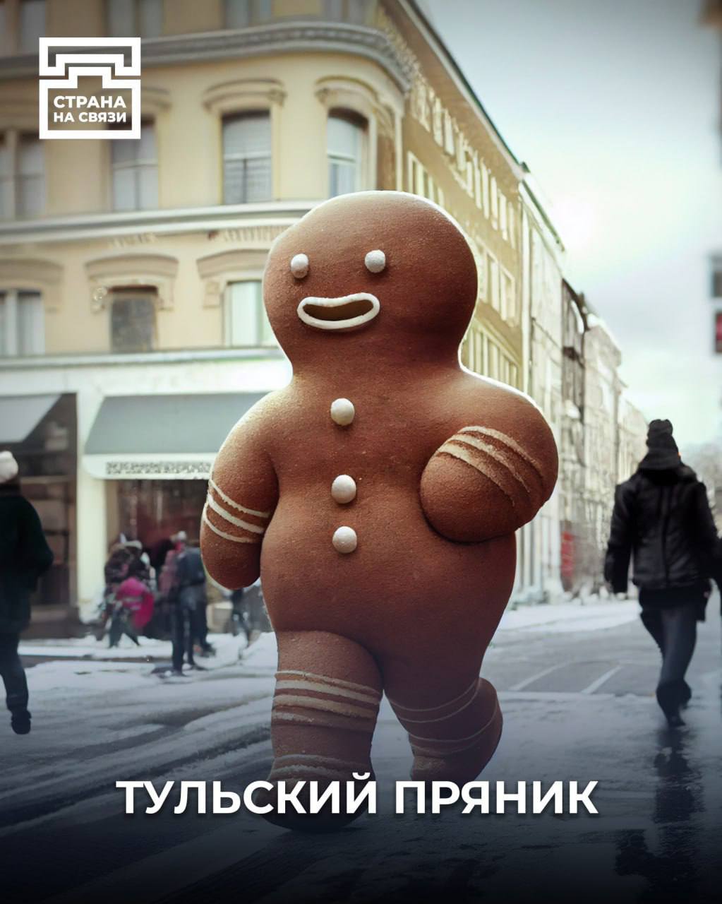 Telegram-канал «Страна на связи» с помощью нейросети показал, как будут выглядеть оживленные символы различных российских городов. Для Тулы это, конечно же, пряник. Символ оружейной столицы представлен в виде огромного пряничного человечка, похожего на персонажа мультфильма «Шрек».