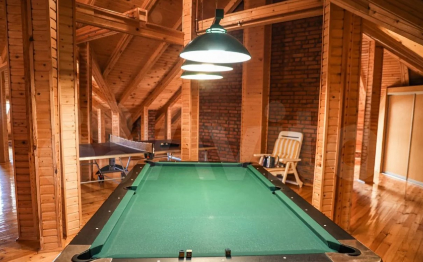 На первом этаже дома расположена терраса, гостиная с каминной зоной, кухня-столовая. На втором этаже находятся спальни и рабочий кабинет. В мансарде отведено место под бильярдную и домашний кинотеатр. На цокольном этаже — сауна и винный погреб. Есть в доме гараж на три автомобиля, бассейн, сауна и SPA-зона.