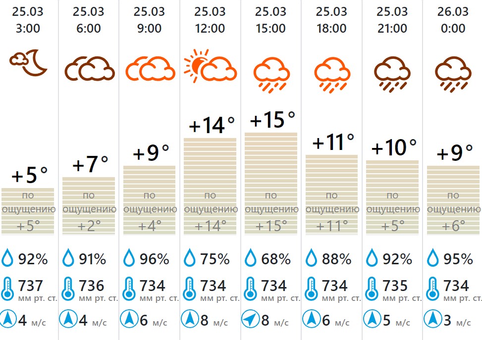 В Туле в субботу 25 марта ожидается пасмурная погода с осадками во второй половине дня. Об этом сообщают синоптики центра погоды «Фобос». Температура воздуха в этот день поднимется до +15 градусов. Влажность воздуха — около 90% утром и вечером и от 60% до 80% днем. Атмосферное давление в течение дня опустится до 734 мм рт. ст. Ветер — от 4 до 8 м/с.
