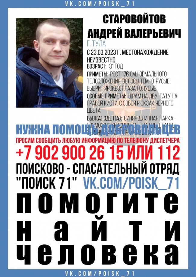 В Туле разыскивают 31-летнего Андрея Старовойтова. По данным отряда «Поиск 71», местонахождение мужчины неизвестно с 23 марта.