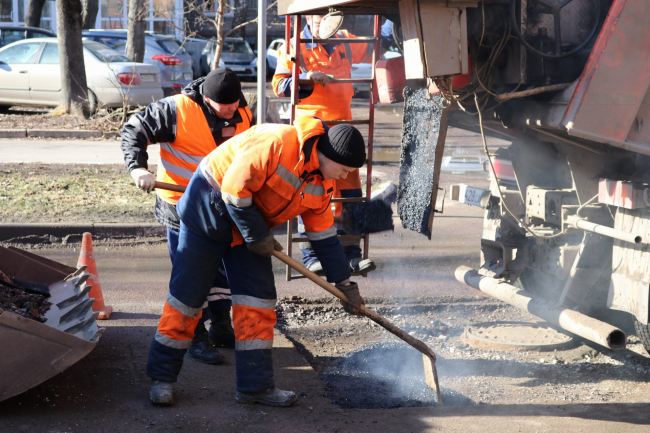 Уровень смотрового колодца поднимают с помощью опорных колец. Их укрепляют цементом, после чего специалисты восстанавливают дорожное покрытие литой асфальтобетонной смесью. Дмитрий Ярцев отметил, что сейчас из-за погодных условий приходится использовать именно ее: ведь литой асфальт обычно применяется дорожниками при минусовых температурах.