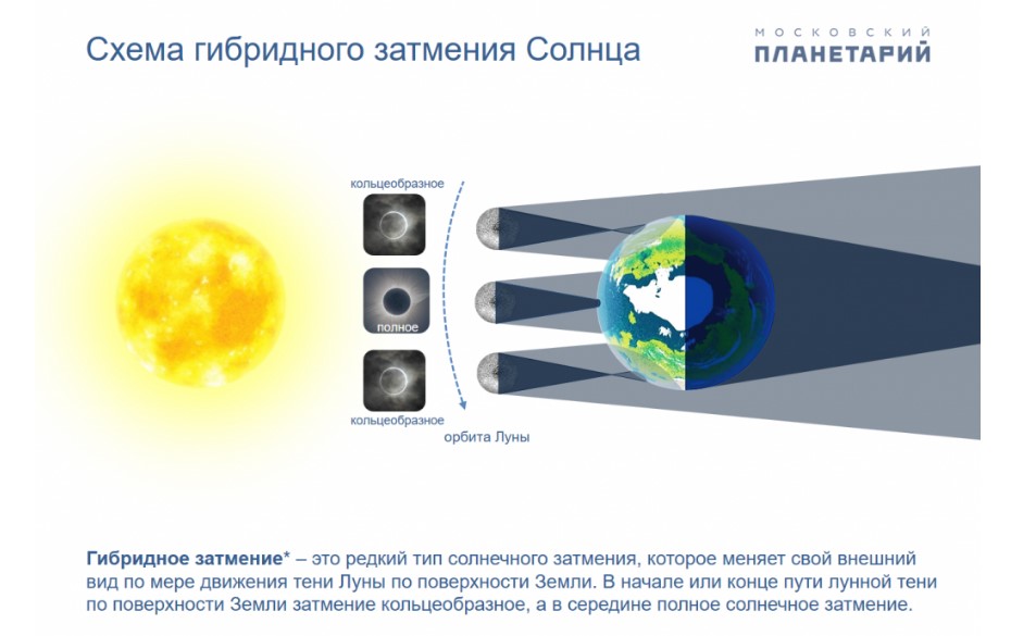 20 апреля ожидается гибридное затмение Солнца. Оно пройдет с 05:37 и до 09:59. Гибридное затмение меняет свой внешний вид по мере движения тени Луны по поверхности Земли. Это редкий вид затмения. В начале и в конце пути лунной тени затмение кольцеобразное, а в середине — полное.
