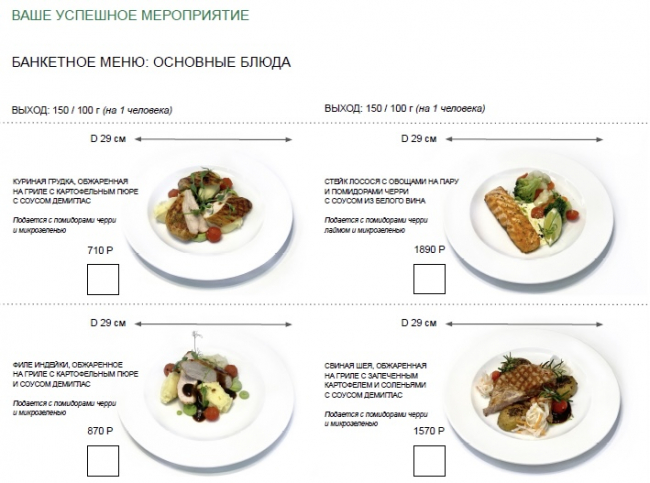 При составлении меню мы старались предусмотреть все важные детали, на которые обращает внимание гость. Это, несомненно, ингредиенты, входящие в состав блюда, визуализация сервировки, расчет блюда на гостя и даже размер посуды. Именно из таких тонкостей складывается общая картина и понимание будущего мероприятия. Важно также то, как мы это меню предлагаем – делаем все, чтобы гостям было удобно и понятно: