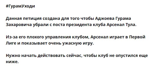Болельщики «Арсенала» требуют отставки президента тульского футбольного клуба Гурама Аджоева. Поражение в домашней игре 8 апреля [оружейники проиграли «Кубани 1:2] стало для фанатов последней каплей. Они создали петицию, в которой просят уволить Аджоева из-за плохого управления клубом и ужасной игры футболистов.