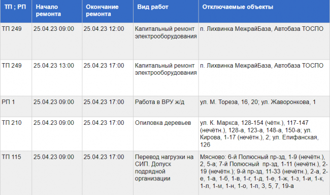 25 апреля «Тульские городские электрические сети» обесточат часть областного центра. Отключения будут связаны с капитальным ремонтом электрооборудования, допуском подрядной организации, а также с плановыми работами по опиловке деревьев в Пролетарском районе.