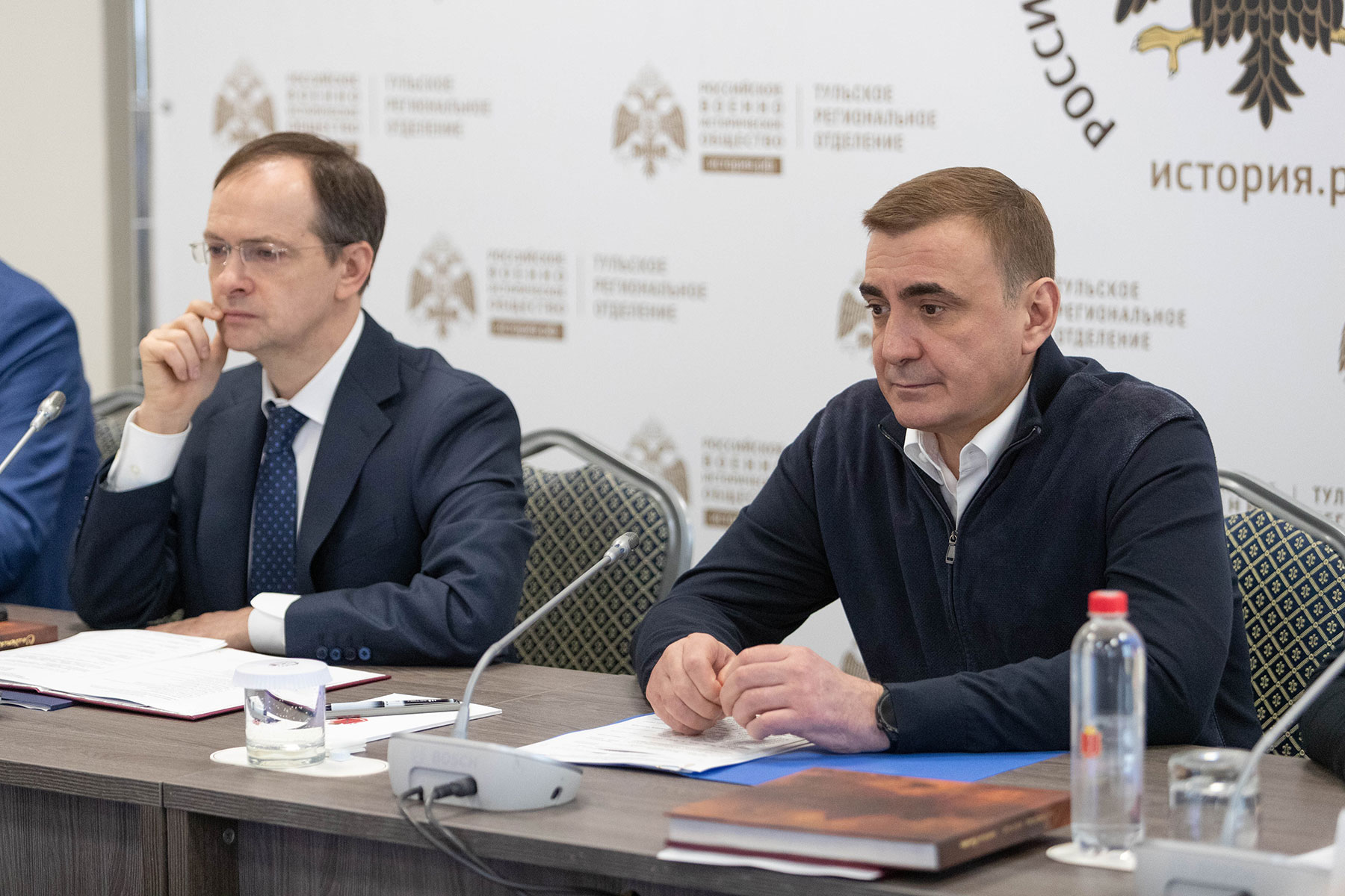 В четверг, 20 апреля, в Тульском филиале ГИМ прошло заседание попечительского совета регионального отделения Российского военно-исторического общества. Участников поприветствовал помощник президента, председатель РВИО Владимир Мединский. Он выразил благодарность губернатору Алексею Дюмину и членам регионального отделения общества за работу по сохранению военно-исторического наследия.