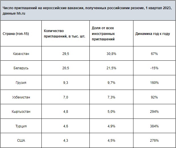 «В то же время в первом квартале текущего года российские резюме не получили ни одного приглашения на вакансии из Бангладеш, Исландии и Норвегии, хотя в первом квартале прошлого года в каждом случае насчитывалось по несколько сотен приглашений. Кроме того, интерес к российским соискателям заметно снизился в Словакии (с 297 приглашений до 9), Франции (с 93 до 3), Великобритании (с 212 до 19), Латвии (с 88 до 9), Италии (с 77 до 19), Польше (с 1,1 тыс. до 327), Финляндии (со 101 до 34)», — отметили в hh.ru.