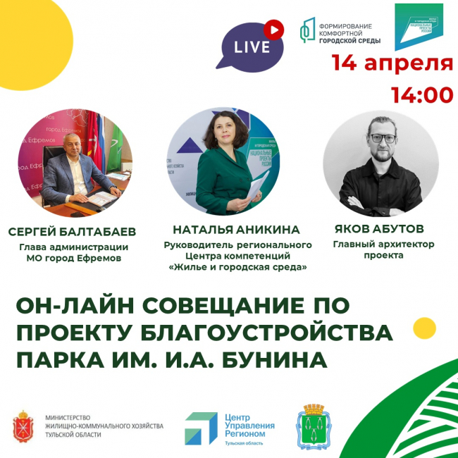 14 апреля глава администрации муниципального образования Ефремов Сергей Балтабаев проведет в прямом эфире рабочее совещание. Обсуждаться будут участие во Всероссийском конкурсе лучших проектов благоустройства в малых городах и, собственно, проведение работ на территории парка имени Ивана Бунина.