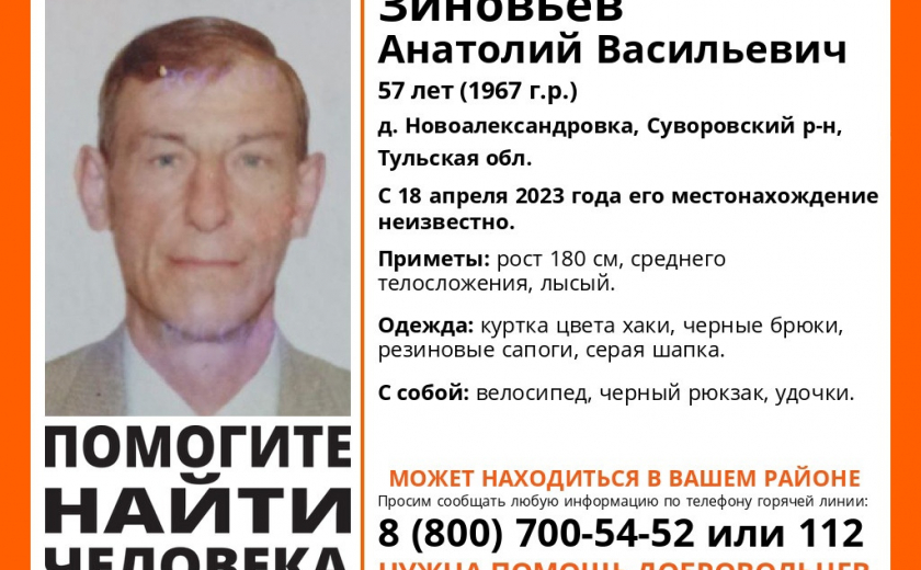 В Тульской области разыскивают жителя деревни Новоалександровка Суворовского района. Как сообщает поисковый отряд «ЛизаАлерт», с 18 апреля местонахождение 57-летнего Анатолия Зиновьева неизвестно.