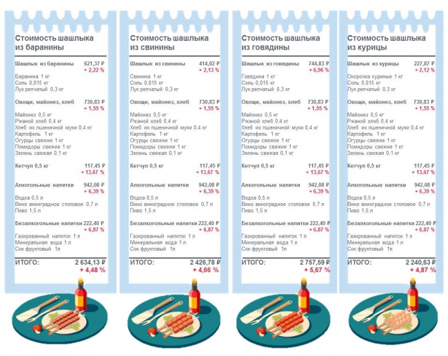 Дороже всего будет стоить отдых на природе с шашлыком из говядины, а бюджетнее всего — с шашлыком из курицы.