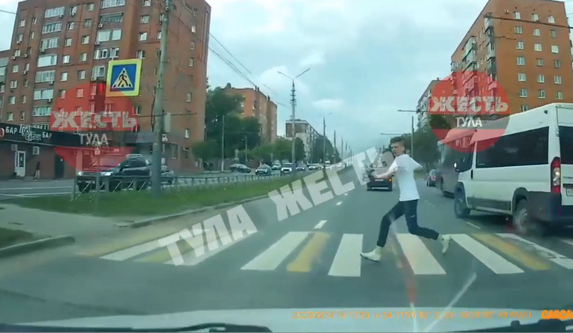 24 мая в Туле на улице Ложевой едва не сбили пешехода. Видео, снятое на регистратор автомобиля, опубликовали в паблике «Тула Жесть».