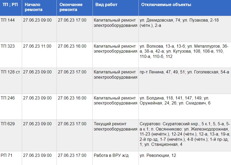 Отключения пройдут из-за ремонтных работ и кронирования. Тулякамстоит ожидать их завершения с 09:00 или 11:00 до 16:00 или 17:00 в зависимости от адреса.